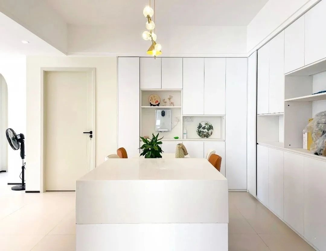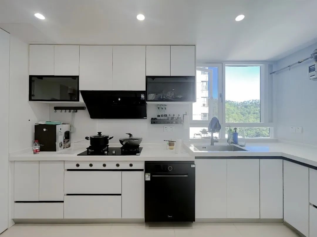 黑白经典配色的厨房,无论何时都耐看!业主喜欢厨房看起来干干净净的,因此选择了白色亚光柜体+白色石英石台面+黑色电器,电器也尽量选择入式电器,创造出极简又时尚的外观。