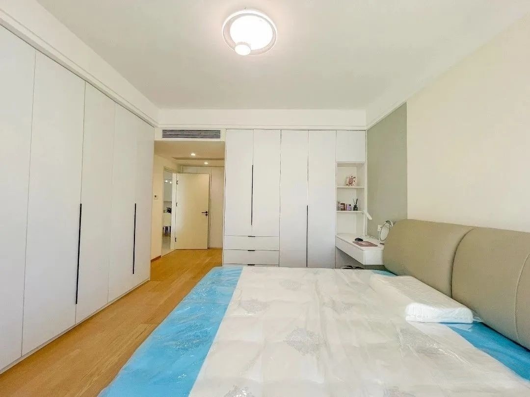 卧室整体延续了简约的风格,两面墙通顶大衣柜,收纳功能杠杠好,靠床的衣柜,选择做衣柜+书桌一体的设计,兼具实用与设计感。